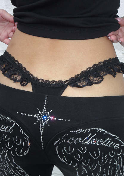 FALLEN RHINESTONE LACE RUFFLE THONG BLACK