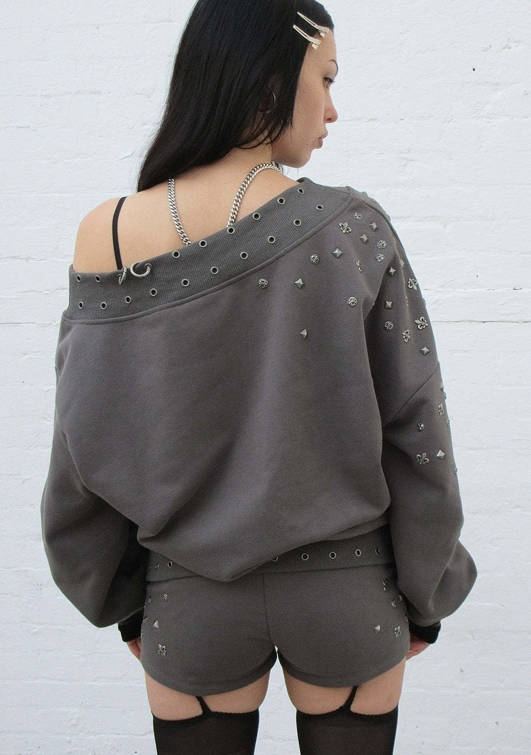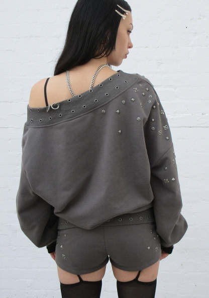 MIDNIGHT STUDDED OFF THE SHOULDER SWEATER CHARCOAL